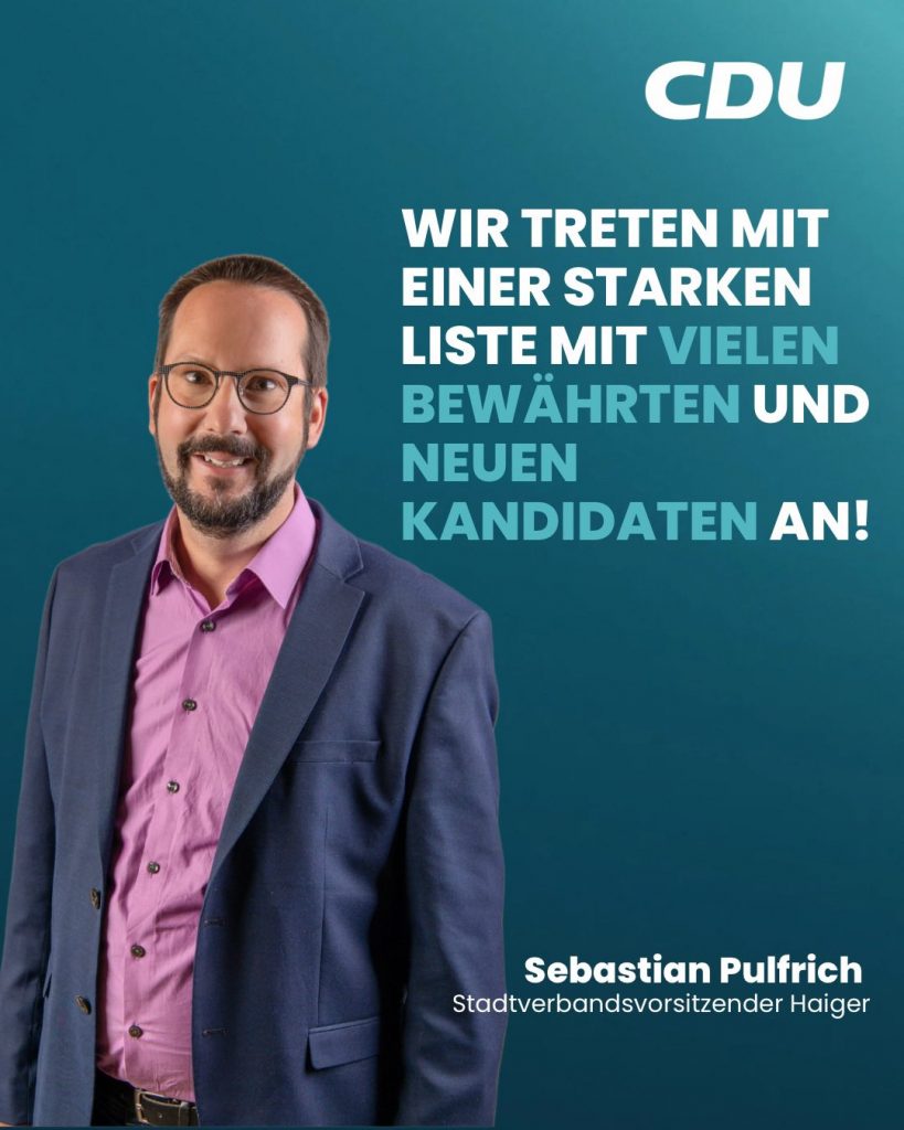 Herzliche GrüßeMit großer Freude und Zuversicht begrüßen wir unseren neuen Bürgermeisterkandidaten, Stefan Thielmann, der mit frischem Wind und klarer Vision für Haiger antritt. Er verkörpert unsere Werte – verantwortungsbewusstes Handeln, Heimatverbundenheit und zukunftsorientiertes Engagement. Gemeinsam wollen wir Haiger weiterentwickeln, die Lebensqualität in allen Ortsteilen stärken und den Dialog mit unseren Bürgerinnen und Bürgern intensivieren. Als CDU-Stadtverband stehen wir fest hinter ihm und freuen uns auf einen starken, konstruktiven Wahlkampf.